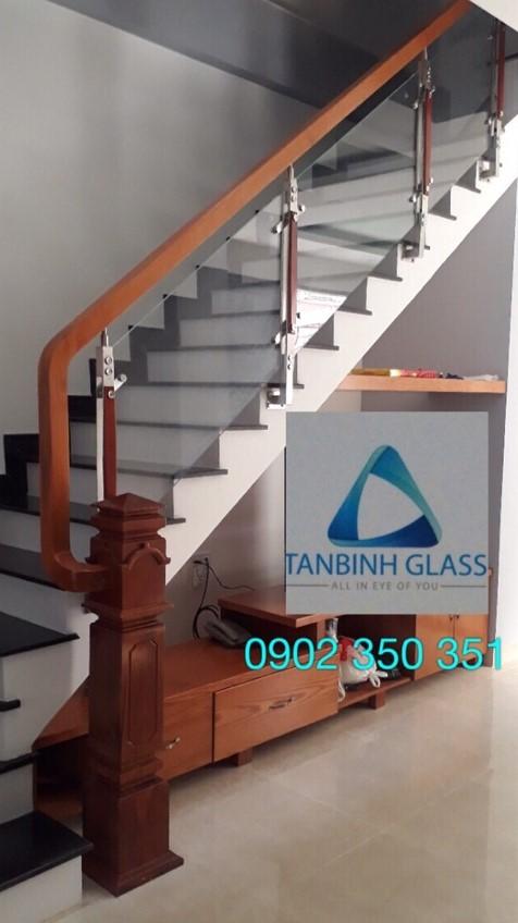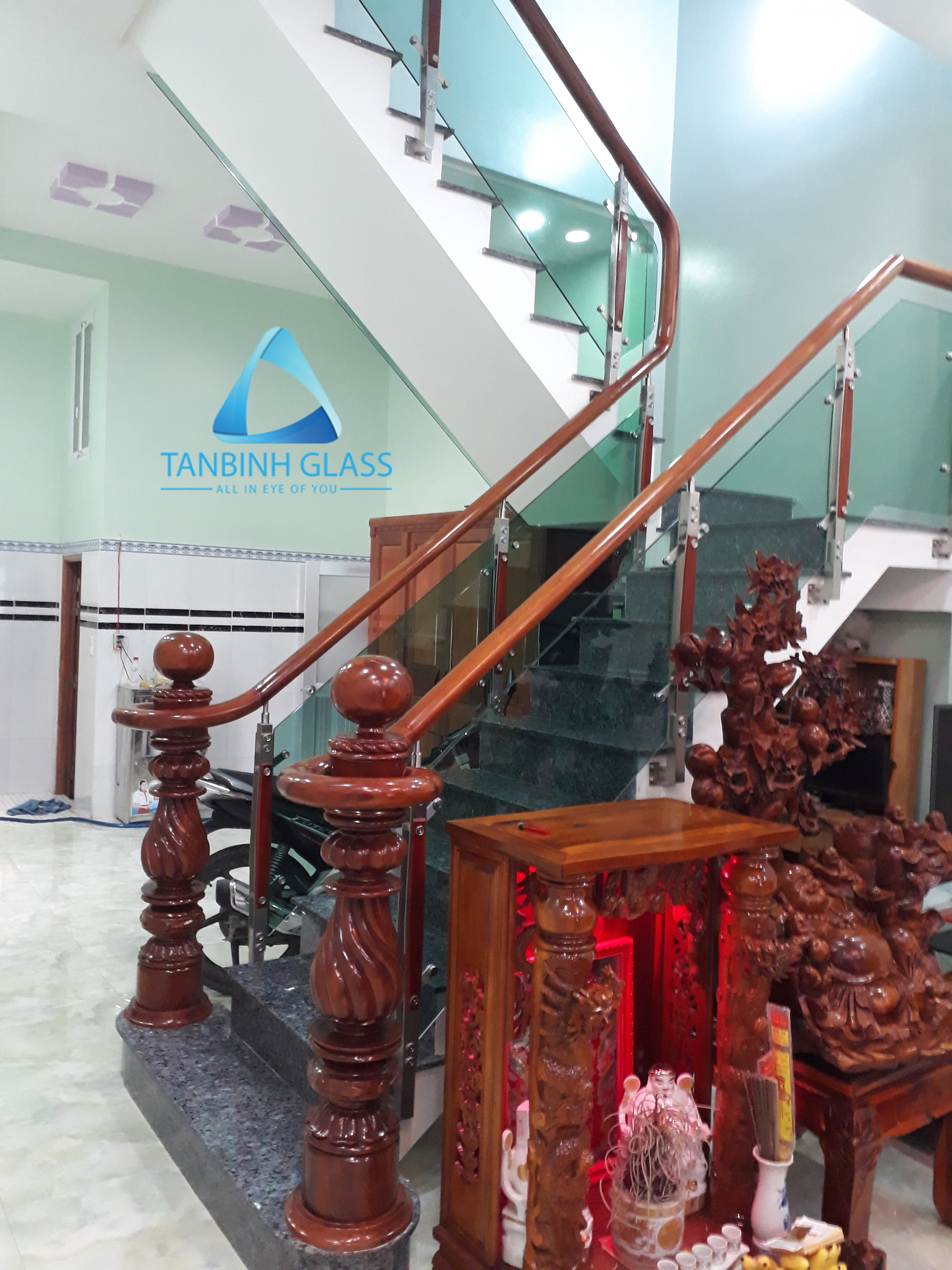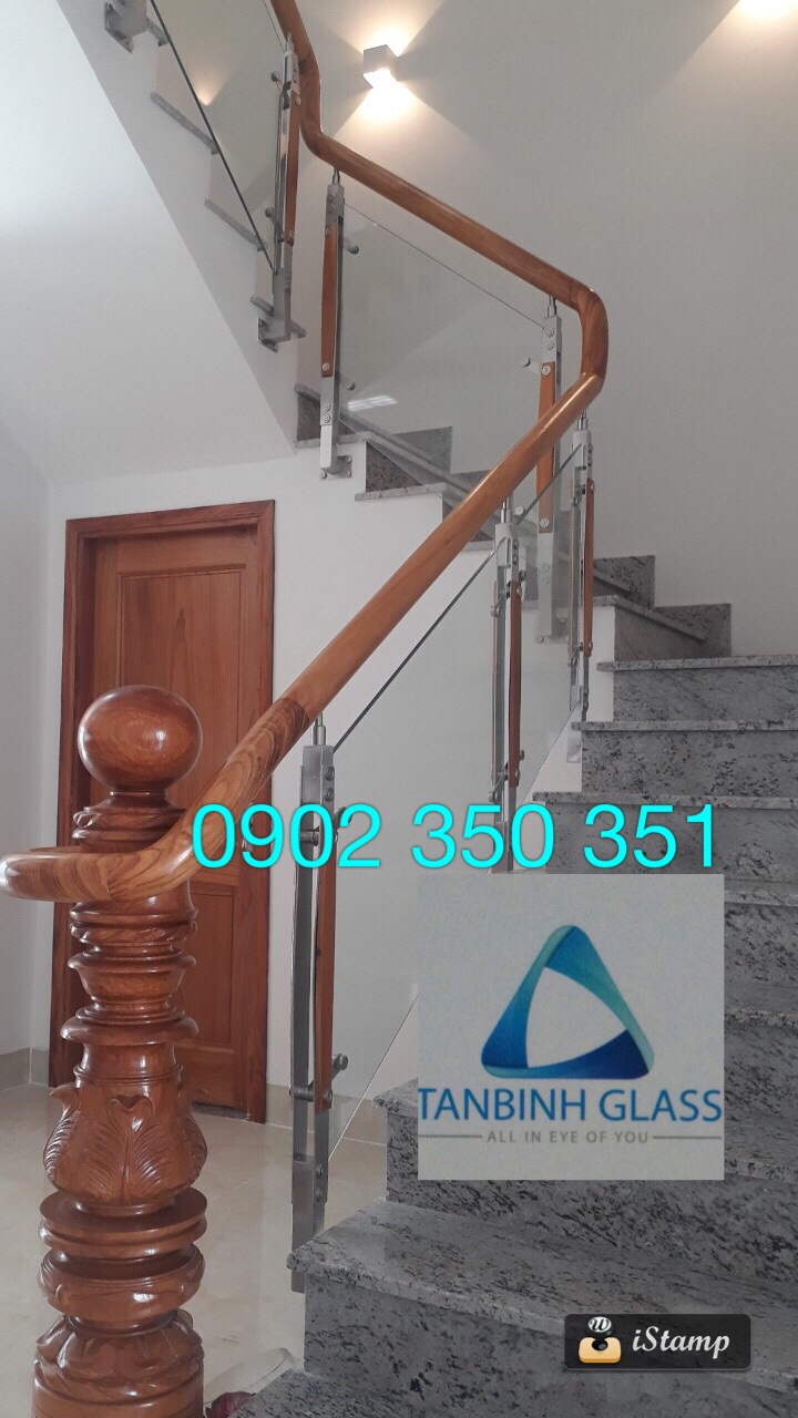 Cầu Thang Kính Tay Vịn Gỗ Vuông.